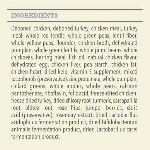 “Deboned chicken, deboned turkey, chicken meal, turkey meal, whole red lentils, whole green peas, lentil fiber, whole yellow peas, flounder, chicken broth, dehydrated pumpkin, whole green lentils, whole pinto beans, whole chickpeas, herring meal, fish oil, Natural chicken flavor, dehydrated egg, chicken liver, pea starch, chicken fat, chicken heart, dried kelp,vitamin E supplement, mixed tocopherols (preservative), zinc proteinate, whole pumpkin, collard greens, whole apples, whole pears, calcium pantothenate, riboflavin, folic acid, freeze-dried chicken liver, freeze-dried turkey liver, dried chicory root, turmeric, sarsaparilla, althea root, rose hips, juniper berries, citric acid (preservative), rosemary extract, dried Lactobacillus acidophilus fermentation product, driedBifidobacterium animalis fermentation product, dried Lactobacillus casei fermentation product.”